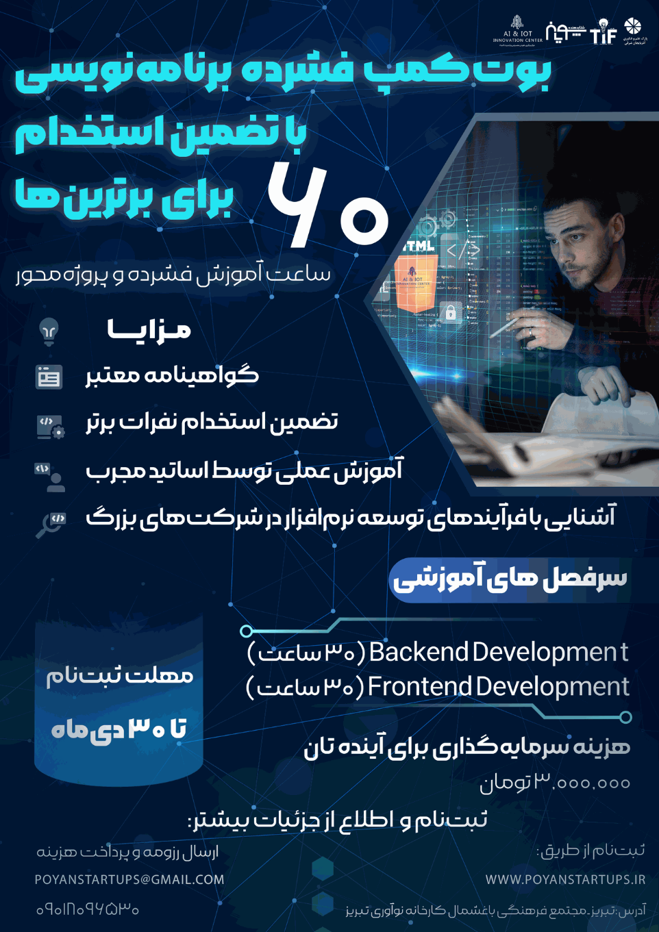 شرکت توسعه کسب و کارهای پویان، به عنوان یکی از پیشتازان صنعت فناوری اطلاعات کشور ، با هدف پرورش استعدادهای جوان و رفع نیازمندیهای تخصصی خود، بوتکمپ فشرده برنامهنویسی را با تضمین استخدام برای برترینها برگزار میکند.